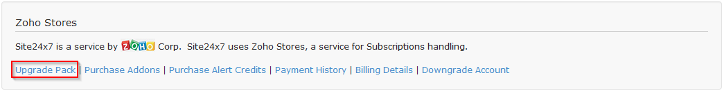 This will take you to the Site24x7 pack listing page under Zoho Stores (Used by Site24x7 for subscription handling.)