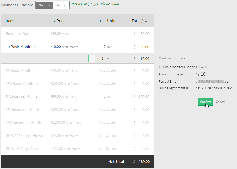 Our subscription model has a concept of basic and advanced monitors. Each subscription package has a set number of basic and advanced monitors. You can choose a specific package based on your business needs and further top-up your pack by purchasing additional add-ons and alert credits. At any given point during your current subscription cycle, you have the freedom to switch over to a different package. We support payment via Credit Card, Paypal and Purchase Order. All payments via Credit Card or PayPal will be auto renewed based on the payment duration opted by you.