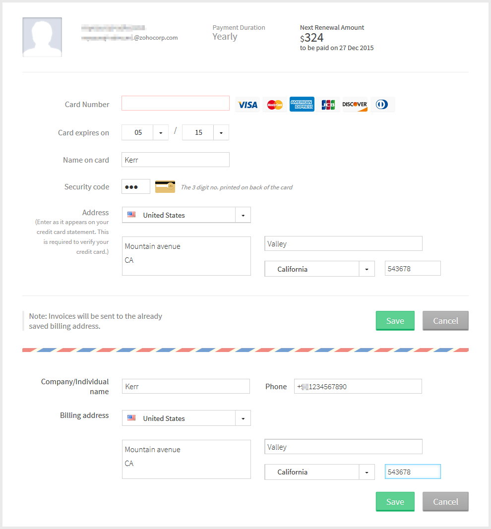 Site24x7 supports the following credit card types: MasterCard, Visa, AmEx, Discover, JCB, and Diners club.