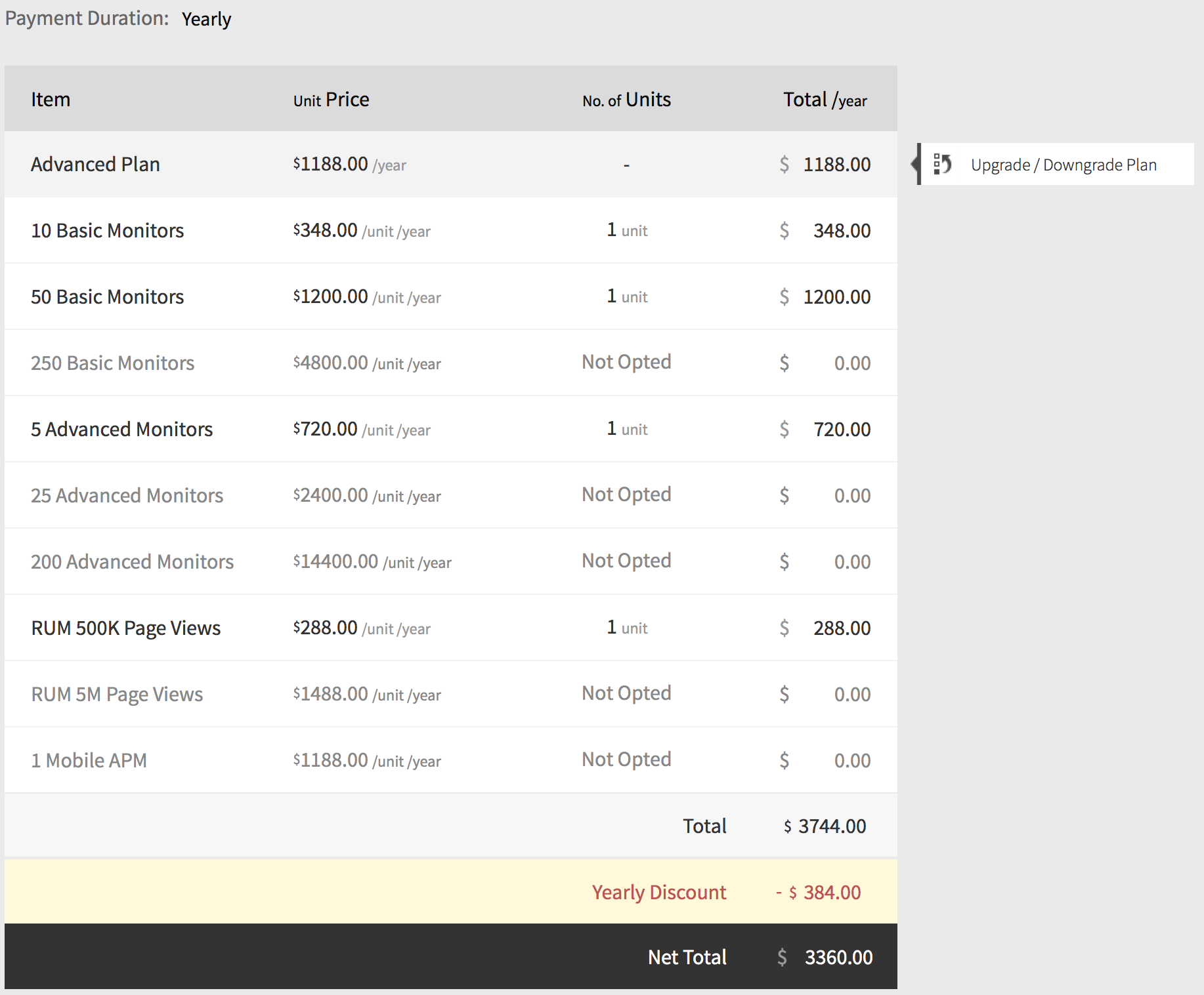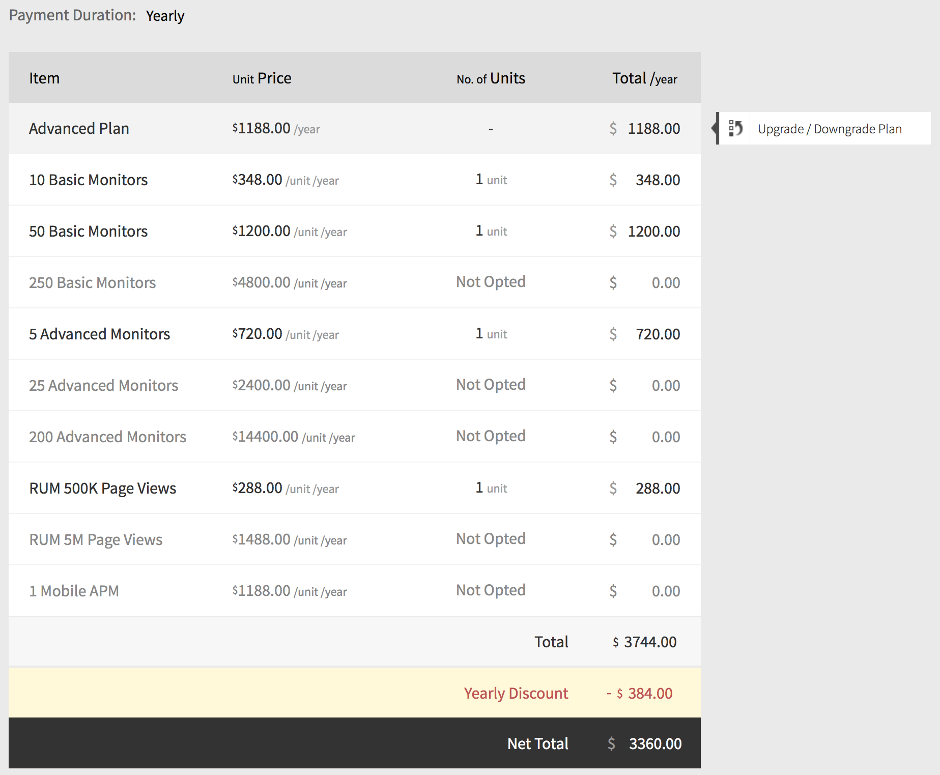 - Enter the required number of units, so as to additionally purchase/deduct basic monitors, advanced monitors or RUM page views. Click Upgrade.