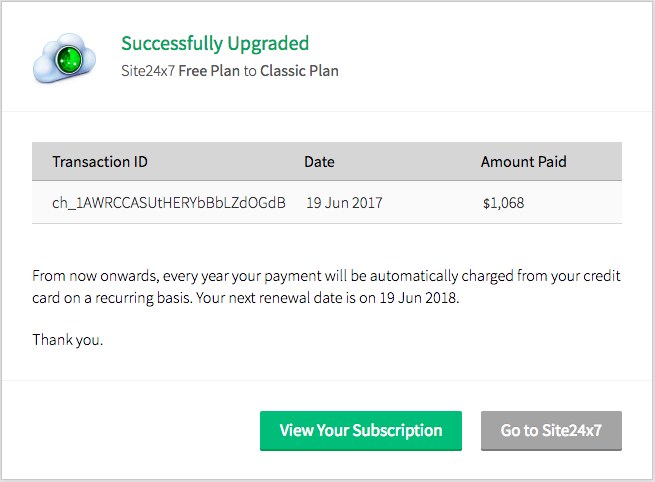 Site24x7 allows you to auto renew your subscription plan at the end of your payment cycle. For offline purchases, you have to contact Site24x7 sales support.