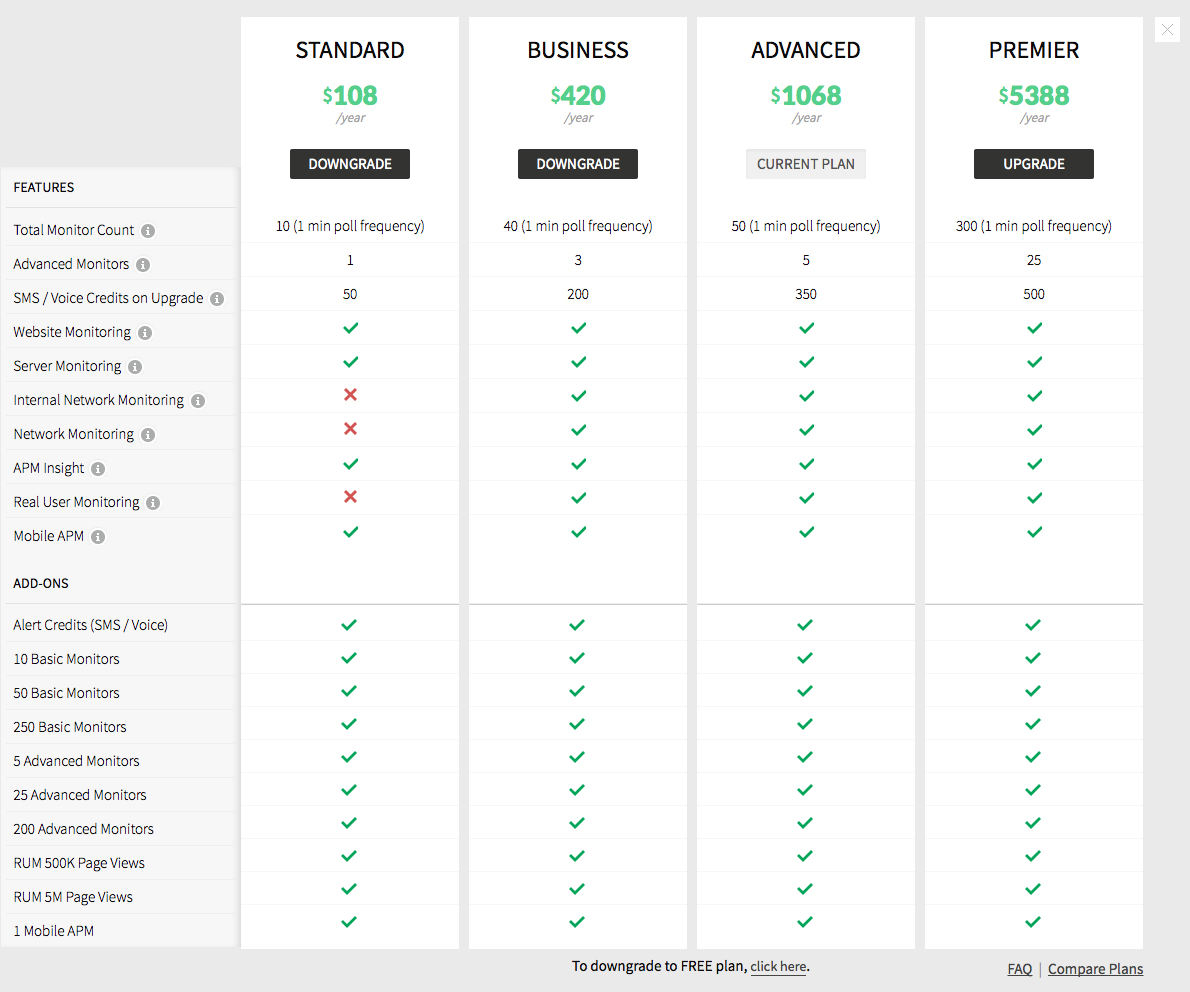 Site24x7 offers a package based pricing model for small IT teams, DevOps to large enterprises. We offer the following packs: Free, Basic, Standard, Business, Advanced, and Premier. There is a 30-days evaluation period and the subscription can be upgraded any time during this evaluation period. The packs will automatically downgrade to FREE account once the evaluation period is completed.