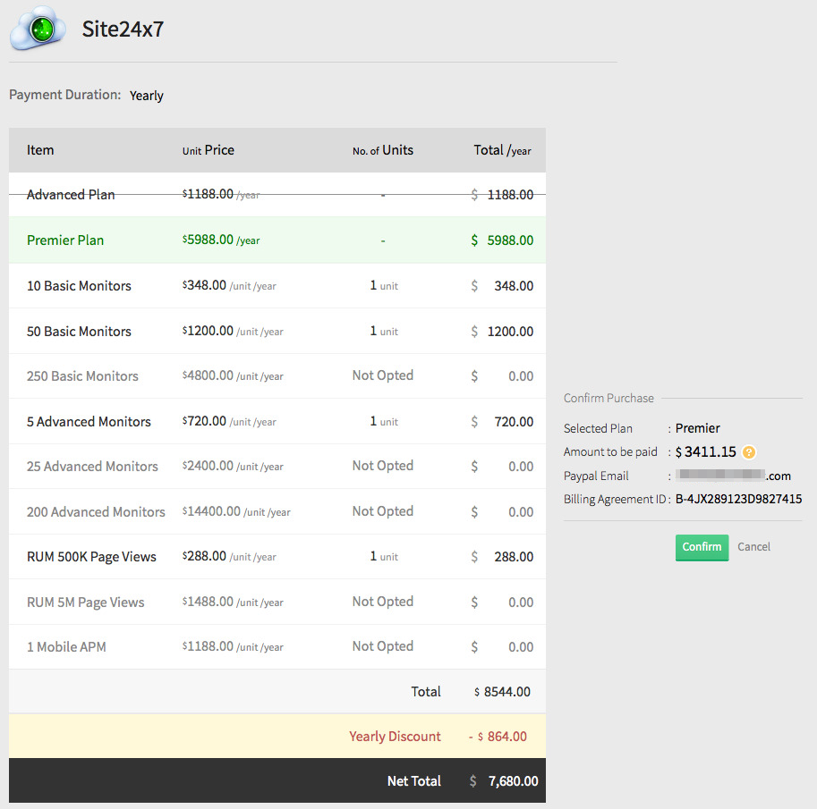 Site24x7 supports payment via Credit Card, PayPal and Purchase Order (PO).