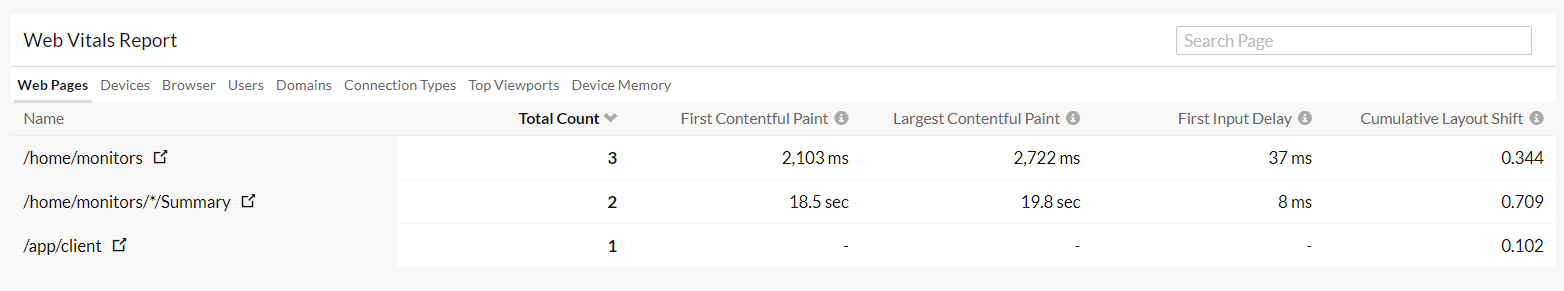 Under Web Vitals Report, you'll get the web vitals reports for Web Pages, Devices, Browser, Users, Domains, Connection Types, Top Viewports, and Device Memory.