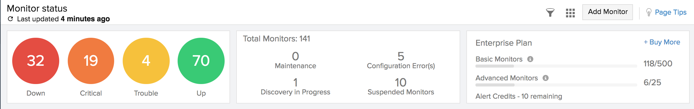 All monitors will now be smartly categorized into various segments according to their current operational status right in your home screen to give you a better understanding of your monitor's performance. Down/trouble monitors are grouped in red. Blue identifies monitors with any configuration errors. Monitors that are under maintenance are grouped under purple. All available monitors are shown in green. Further, each configured monitor's response time (in ms) along with its last polling time is also listed in this report.