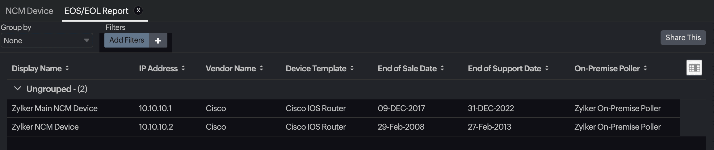 The end of sale (EOS)/end of life (EOL) report in Site24x7 Network Configuration Manager (NCM) provides visibility into device lifecycle statuses, helping IT teams proactively plan device replacements and avoid compliance risks.